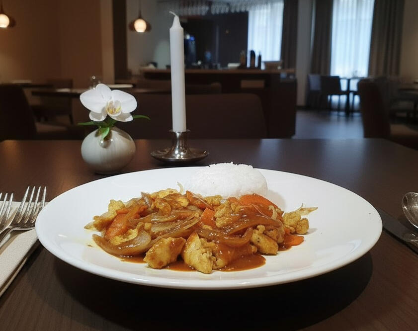 Panang Chicken Curry (Hot) .................. $17chicken pieces in our special dry curry,cooked from tasty panang curry paste and coconut milk, served on mixed vegetables