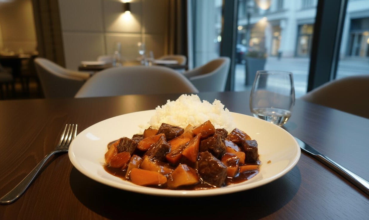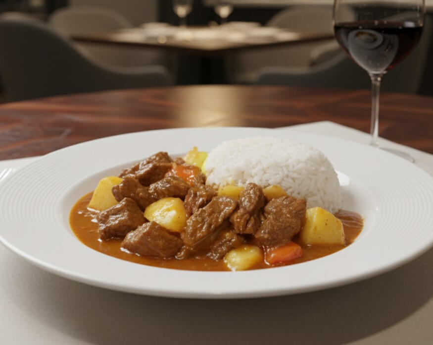 Vegetables (39%) (Potato, Carrots), Steamed Rice (34%) (Rice, Water), Cooked Beef (18%), Soy Sauce (2.5%) (Soybean, Wheat Flour, Salt, Sugar, Water) Dark Soy Sauce (0.5%) (Soybean, Wheat Flour, Water, Salt, Sugar, Extract of Mushroom), Water, Garlic, Cocoa, Star Anise, Salt, Galangal, Dry Chilli, Coriander, Sugar, Cinnamon, Pepper